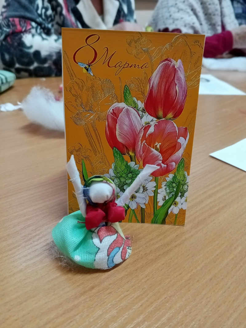Специалист по социальной работе Куванова Марина Александровна в ходе творческой встречи познакомила присутствующих с оригинальной техникой рукоделия «Лоскутная пластика». Тряпичную славянскую обережную куклу «Радостея» (Благодать) из ярких лоскутков изготовила своими руками каждая участница.