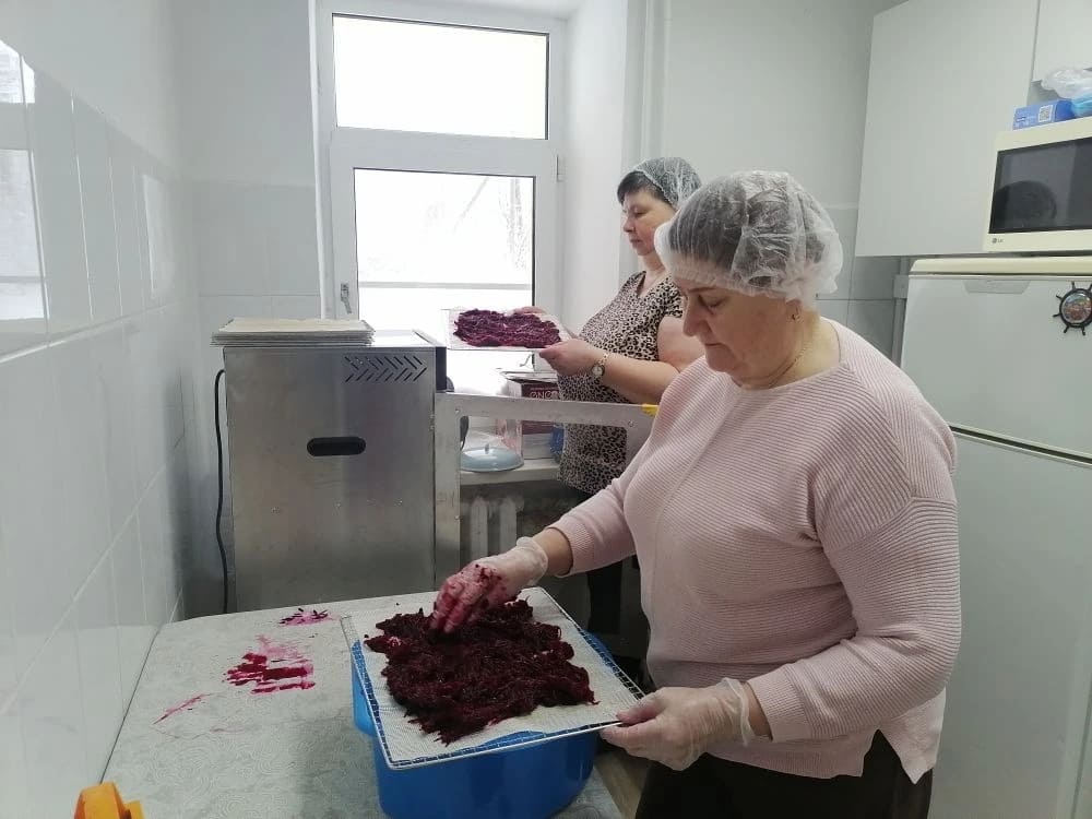 Сотрудники отделения "Специализированный жилой дом для граждан пожилого возраста и инвалидов" ГБУ "КЦСОН Краснобаковского муниципального округа" продолжают сушить продукты для изготовления сухих супов, отправляемых в зону действия СВО