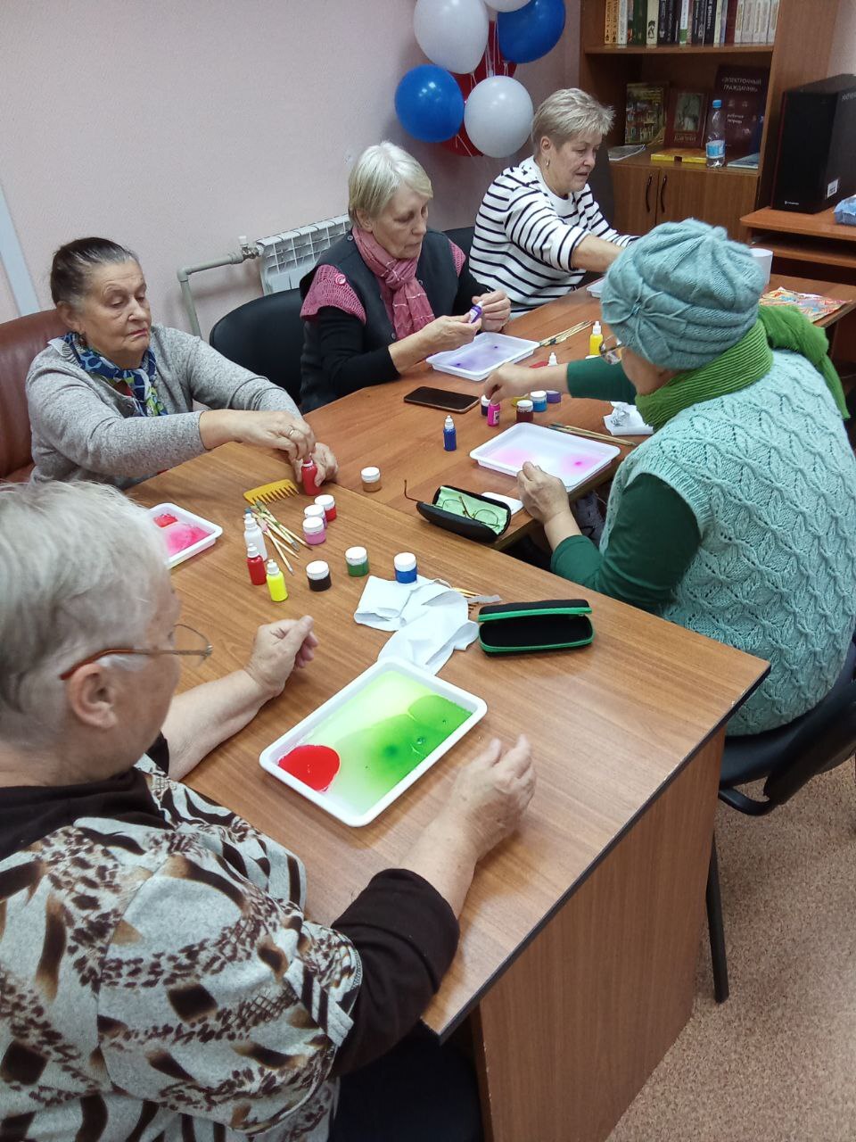 🎨 Вчера на базе Центра общения старшего поколения специалист нашего Центра провел мастер-класс по рисованию в технике Эбру.